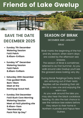 By becoming a financial member of Friends of Lake Gwelup, you will have the opportunity to support and help the community while enjoying various benefits. These benefits include access to exclusive events, voting rights on important issues relating to the reserve and the satisfaction of contributing to the preservation of Lake Gwelup's natural beauty. Membership fees help us to pay for things like morning tea for volunteers, upkeep of equipment and certificates for our young volunteers.